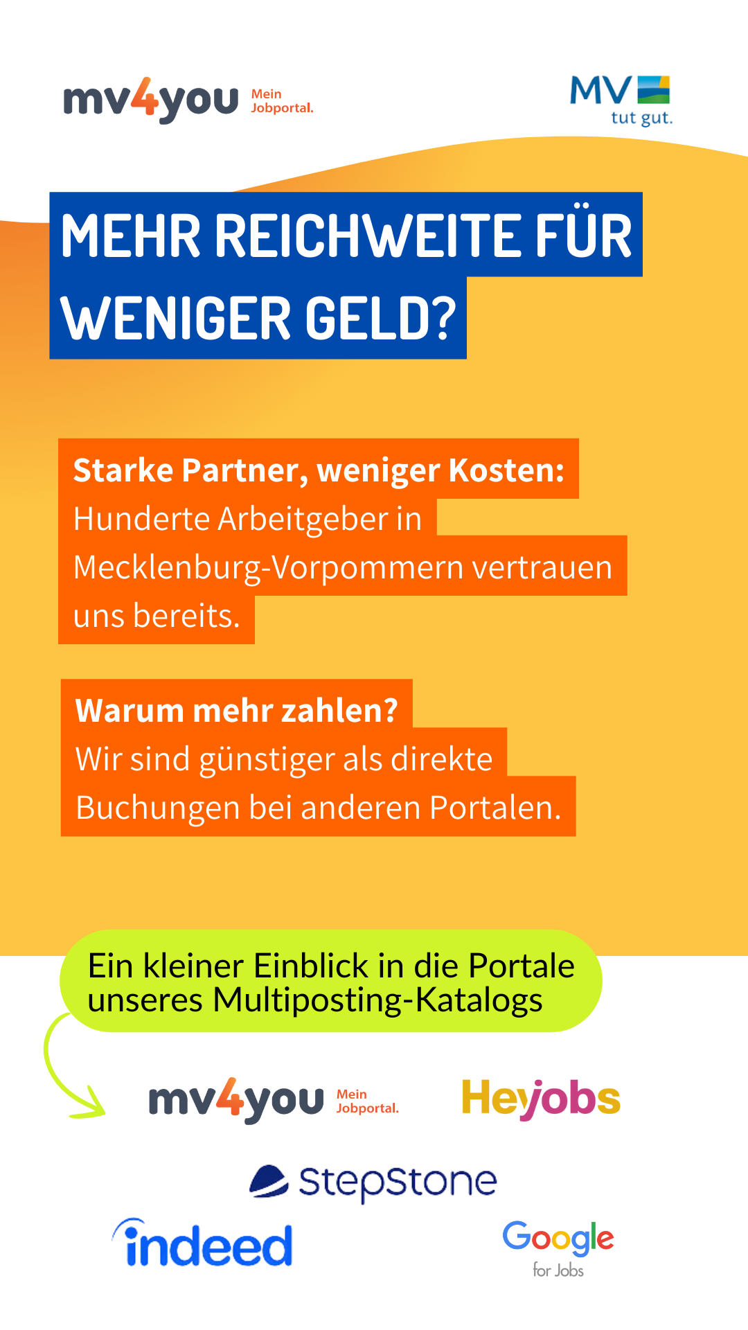 - Ihre Stellenanzeige wird auf mv4you.de veröffentlicht und auf Wunsch auf führenden Plattformen wie Indeed oder StepStone ausgespielt.
