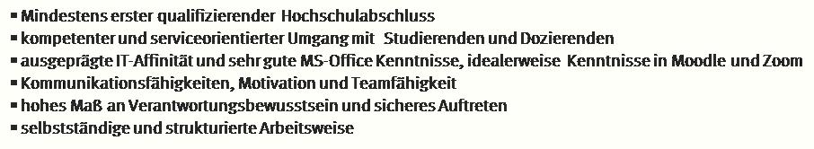 - kompetenter und serviceorientierter Umgang mit Studierenden und Dozierenden